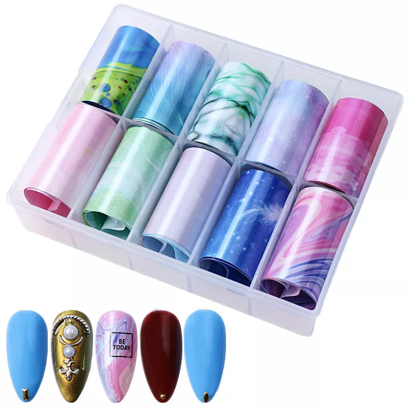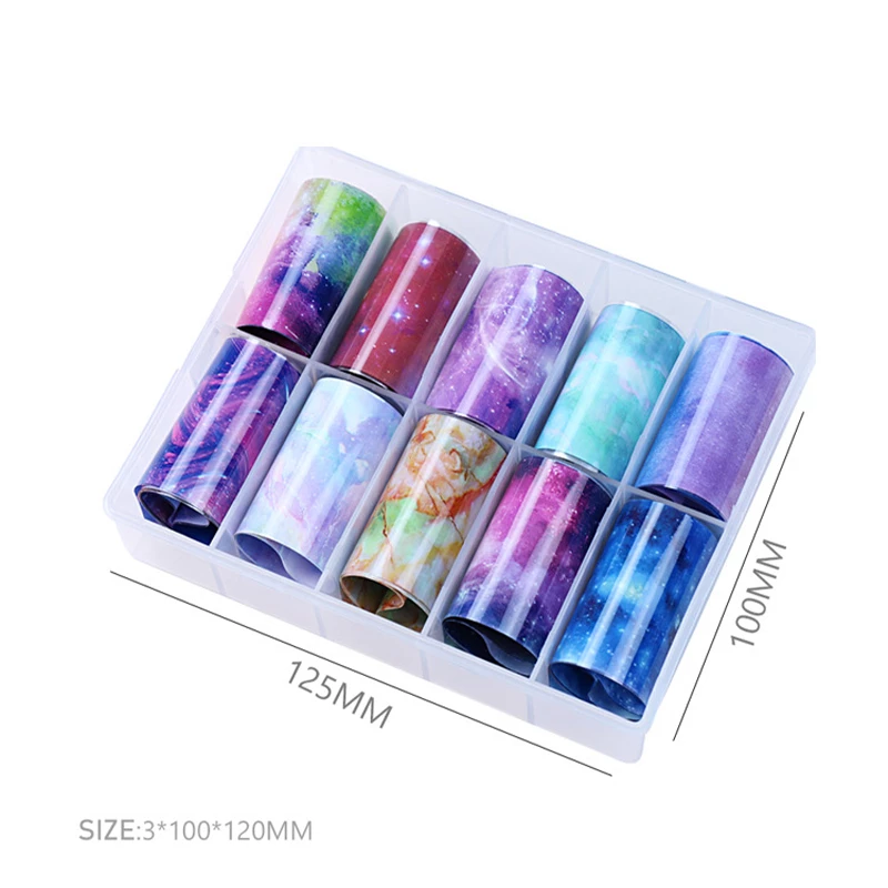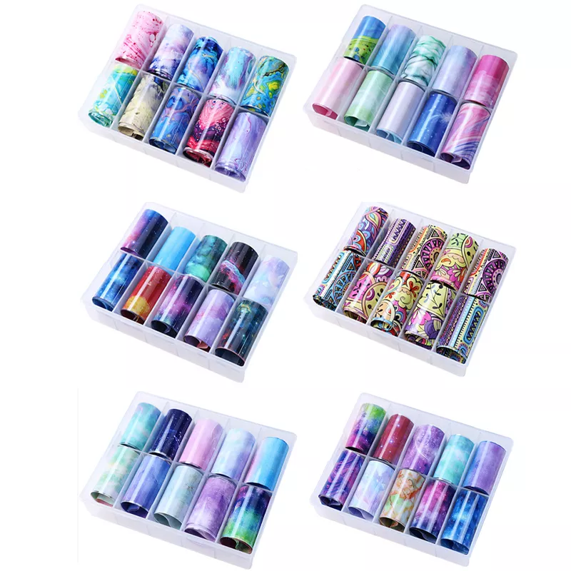 Crafted from high-quality, flexible PET material, each foil in the set ensures smooth application and crisp transfer. The full set features 6 distinct series, each containing 10 foil designs, ranging from swirling nebulas and dreamy galaxies to stardust patterns and surreal textures. The wide variety of patterns makes this an ideal choice for both nail art beginners and professional technicians looking to elevate their work.