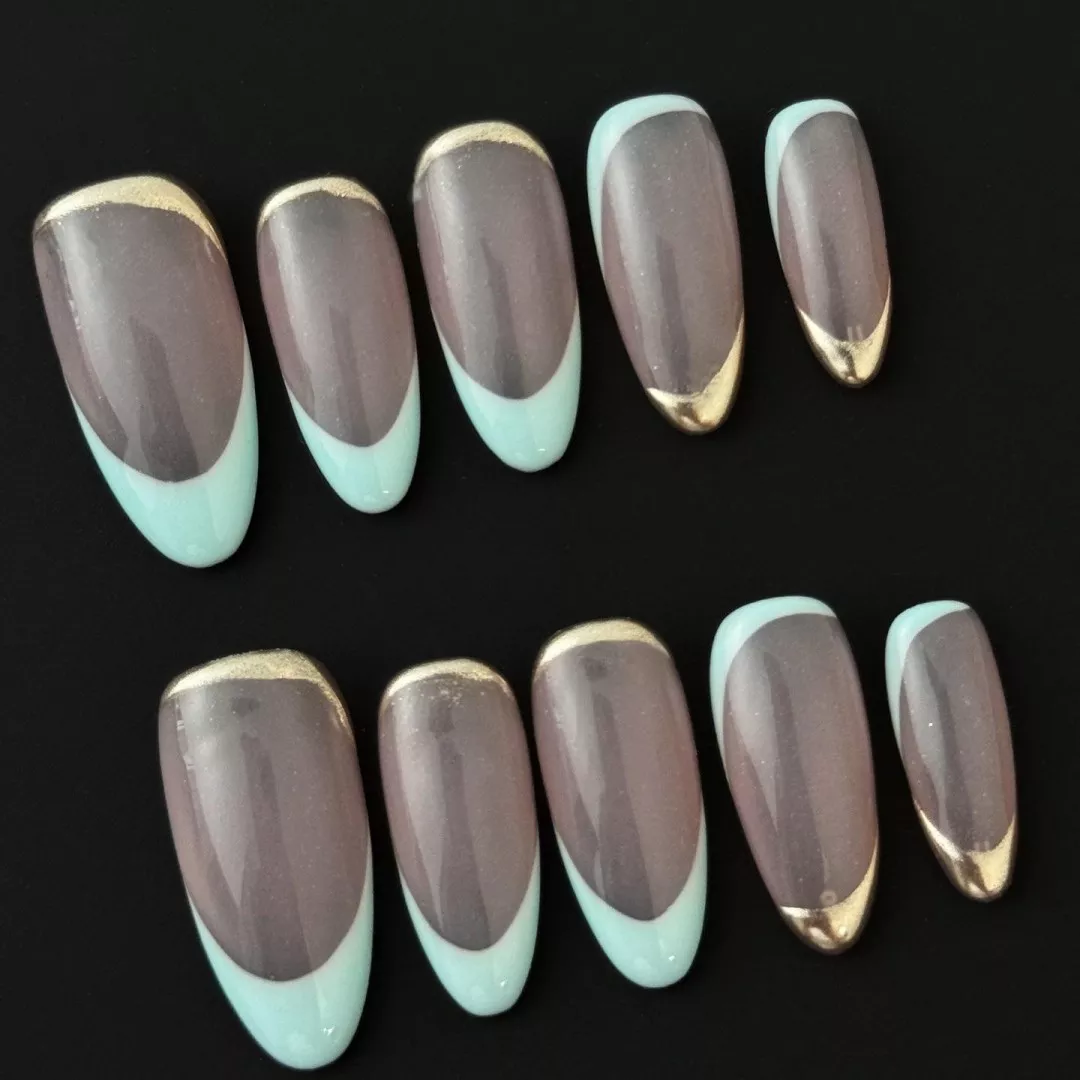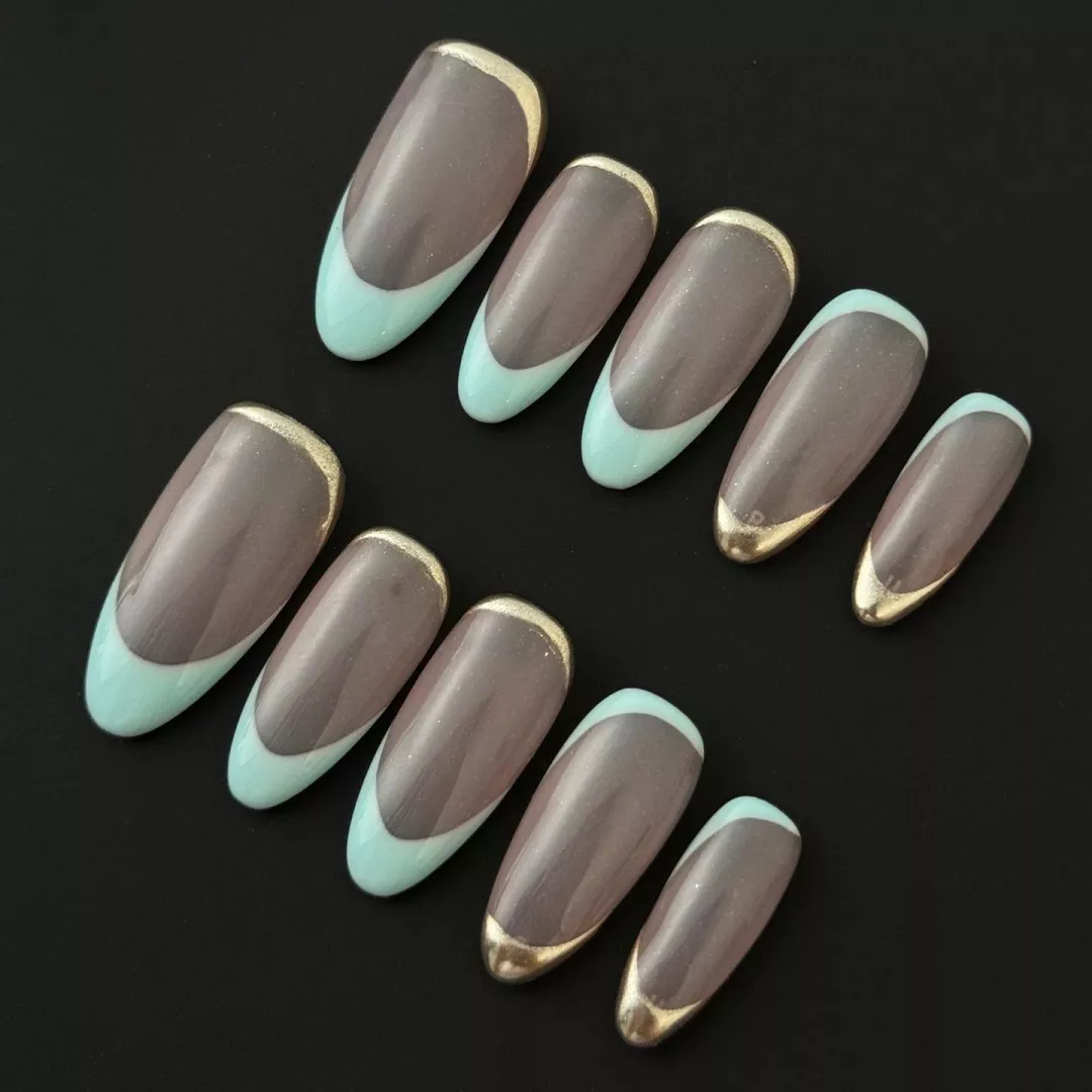 Experience refined minimalism with our Gold Edge Press-On Nails, where chic design meets cool-toned elegance. This premium set features a unique French manicure layout, blending soft taupe bases with minty tips and finished with a metallic gold edge. The result is a harmonious balance of freshness and sophistication that transitions seamlessly from daytime wear to evening glam.